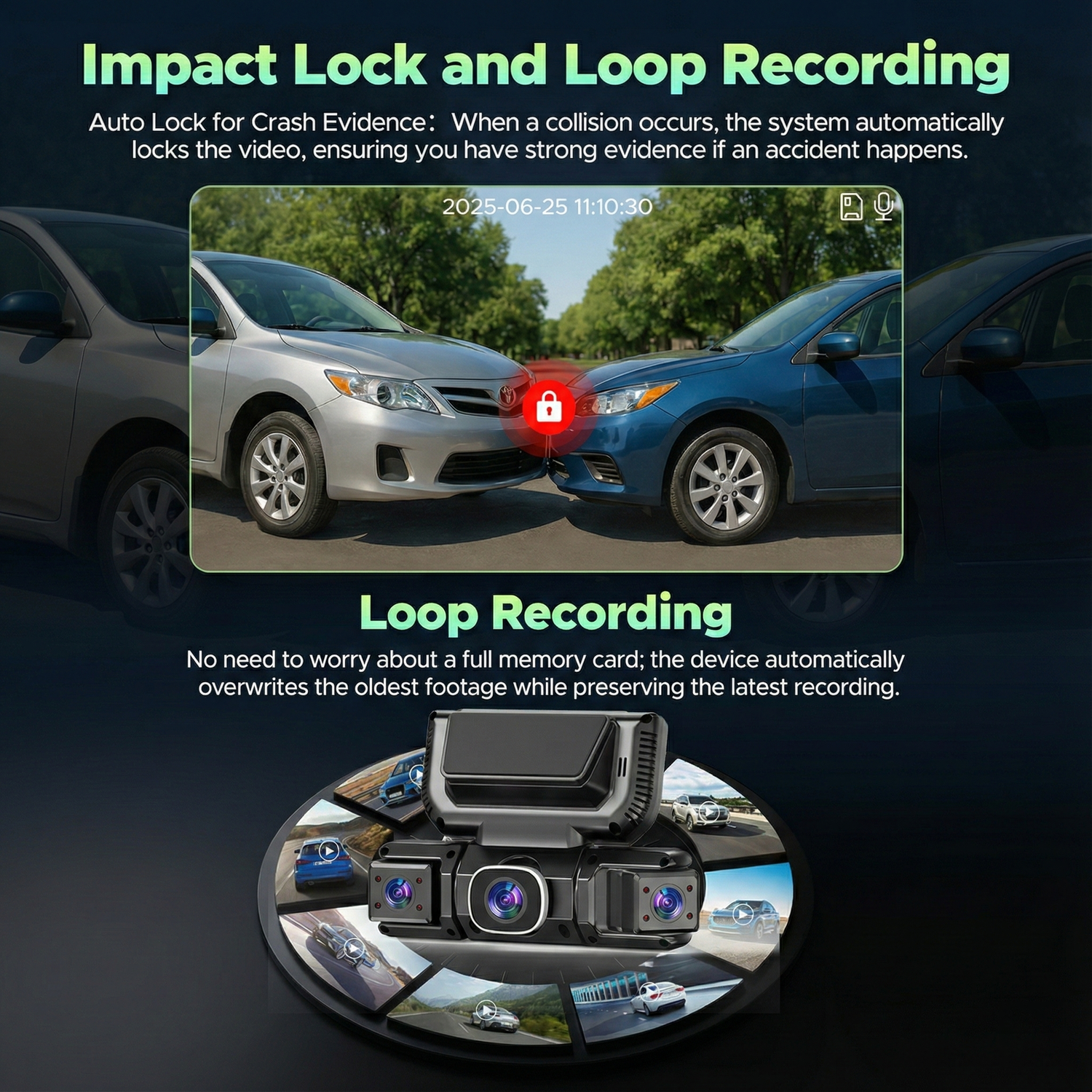 Detects impacts and permanently locks the video file to prevent deletion.