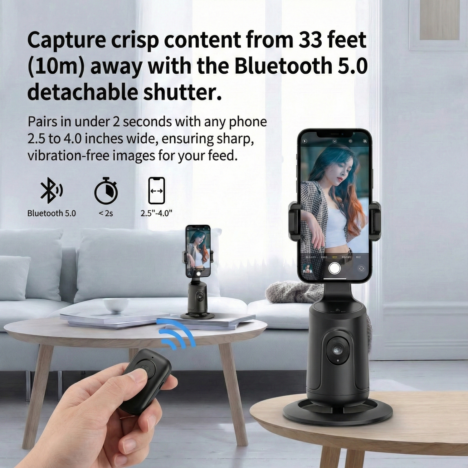 Capture crisp content from 33 feet (10m) away with the Bluetooth 5.0 detachable shutter. Pairs in under 2 seconds with any phone 2.5 to 4.0 inches wide, ensuring sharp, vibration-free images for your feed.
