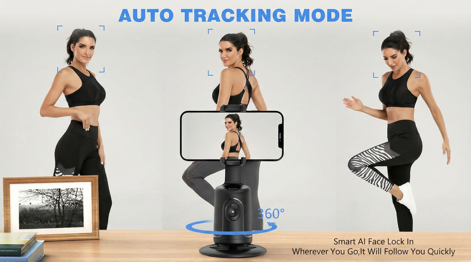 With 360°rotation, the auto-tracking phone holder allows you to switch from portrait or landscape orientation when taking a picture. At the same time, it could be moved up and down for a better shooting angle. Wherever you, fast follow.