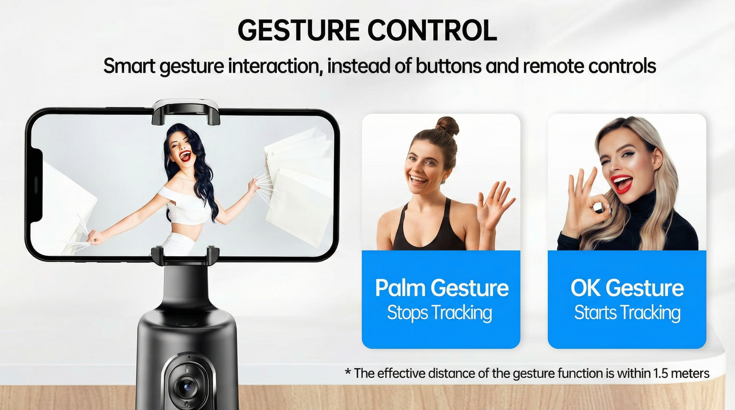 Are you often troubled by the need to adjust for interruptions and start video conferences? The auto-face tracking tripod is your ideal choice. Our smart shooting holder can gesture control. If you need to stop the video for a while or start your live stream. All you have to do is raise your palm, facing the camera, and the stand will stop working. You make an OK gesture and the stand will start working again.