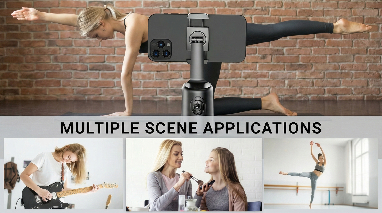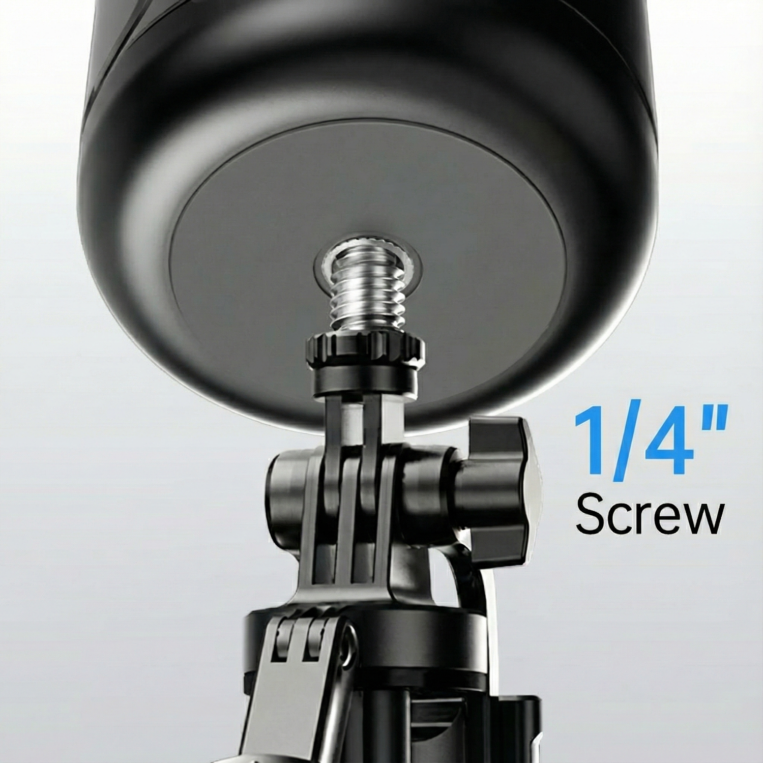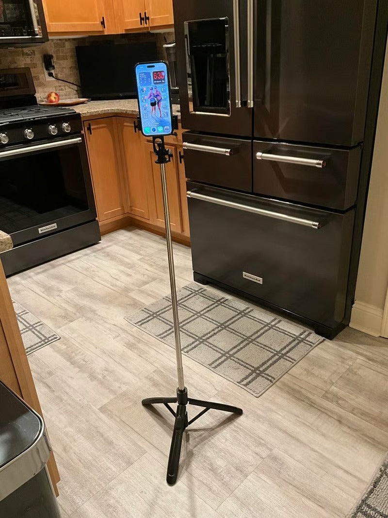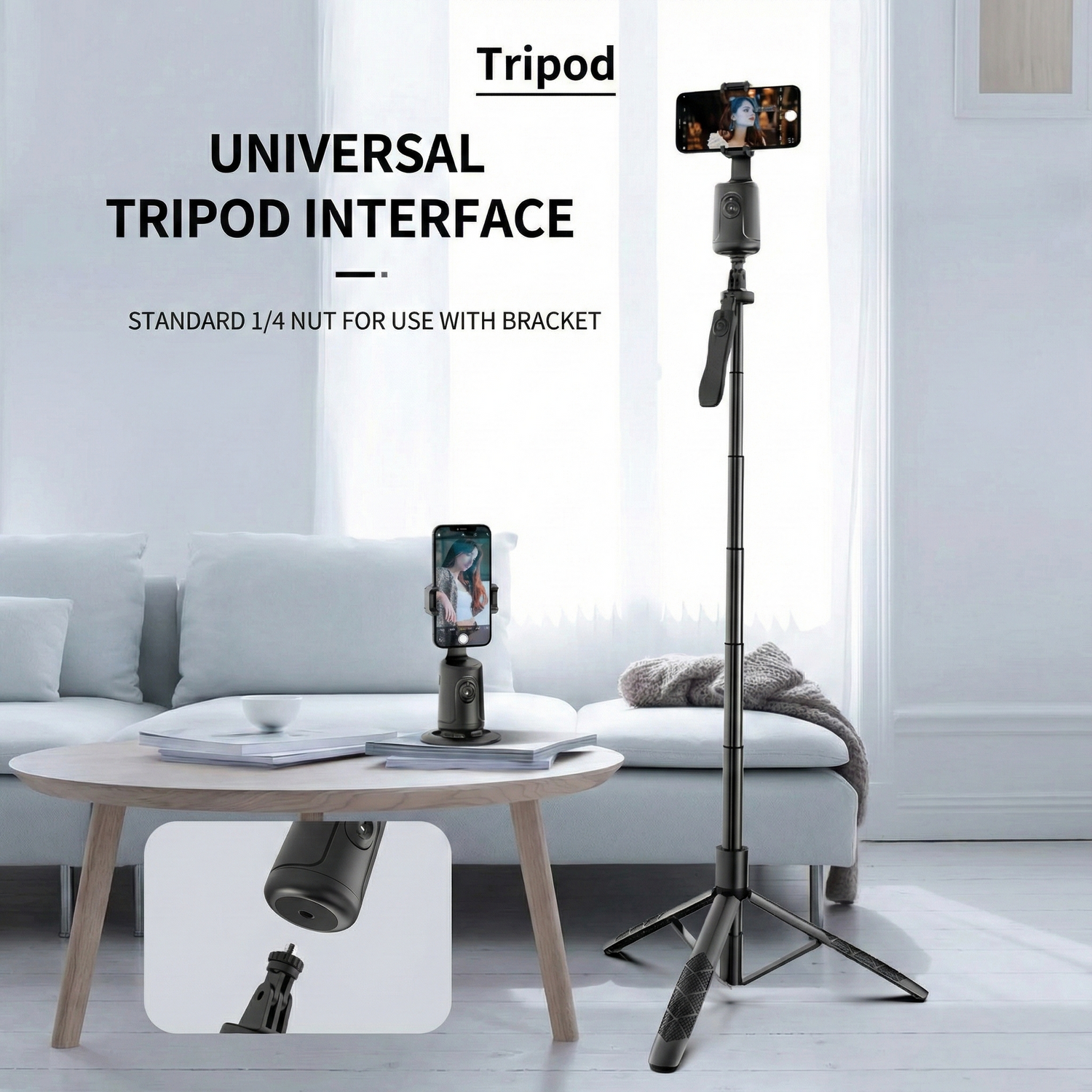 This smart tracking phone holder has a standard 1/4" screw thread on the bottom to fit the tripod (tripod is not included), allowing you to place it wherever you want, and adjust it for desired shooting height.